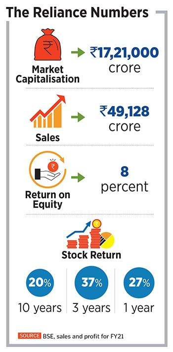 For now, Reliance Industries is still priced using a sum of the parts valuation metric. While the legacy hydrocarbons business is a drag, the new age telecom and retail businesses have been ascribed higher terminal values by the market. At a market cap of ₹17,21,000 crore, it has surpassed rival Tata Consultancy Services valued at ₹13,33,000 crore. The stock trades at about 30 times FY22 earnings and a return on equity of 8 percent.