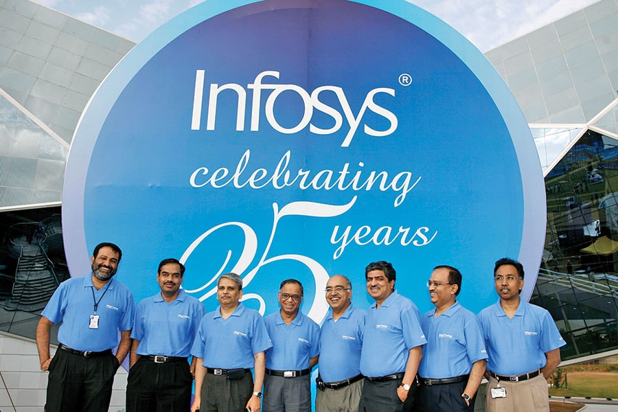 Nandan Nilekani (third from right), stands alongside other founding and board members of Infosys as the IT company commemorates its 25th year on July 31, 2006. Nilekani was then CEO, president and managing director of Infosys
