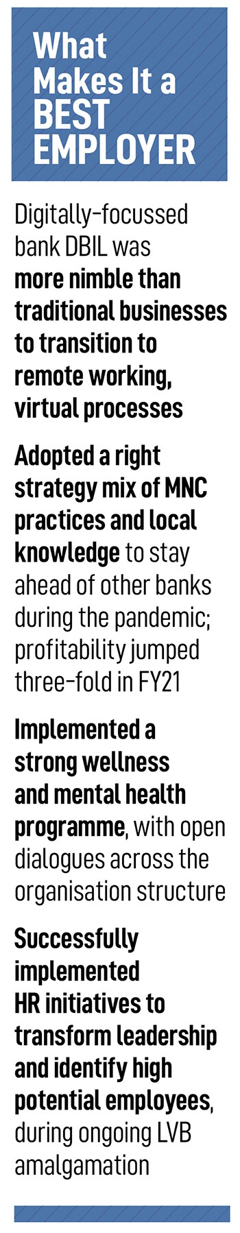 The fact that DBS Bank India Ltd (DBIL) has been voted into the Forbes India-Kincentric Best Employer 2021 list for the second successive year indicates that this well-capitalised, digitally-focussed, wholly-owned subsidiary of Singapore-based DBS is not just riding through a tough phase. It is doing it at the right pace, has prioritised HR, training and workforce planning, and knows where it is going.