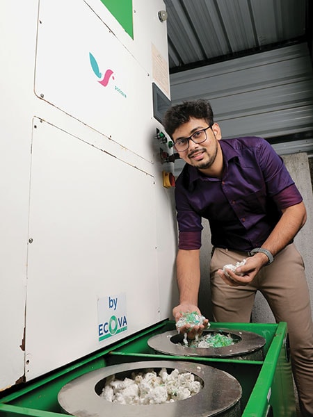 Dhariya comes from a business family in Raigad, and that he would eventually move into entrepreneurship once finishing his degree was clear to him despite his inherent dislike for suits and ties (“The blazer hanging in my car is only for official meetings," he laughs gingerly during the photo shoot. “I’m most comfortable in my T-shirts"). He dabbled in a number of sectors during his college—energy, sustainability—but once he ran into the problems of menstrual hygiene management, he was hooked. For a year after graduating in 2017, he worked as an R&D engineer on an Isro project by day, but outside of his office, he devoted his hours to developing the mechanism that would disinfect sanitary pads and plough them back into a closed loop of production and consumption, titled ‘circular economy’ in modern parlance.