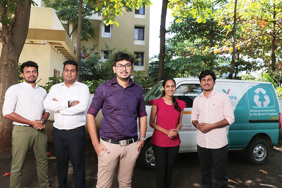 Team PadCare Labs: (From left) Amit Jadhwar, operations lead Asif Dharwadkar, general manager, sales and operations Ajinkya Dhariya, founder and CEO Aasawari Kane, research scientist Shriniwas Adhe, product manager