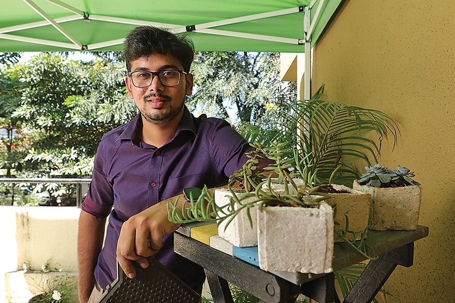Ajinkya Dhariya with products like plant pots, composite table and paver blocks that are made using the recycled sanitary pads