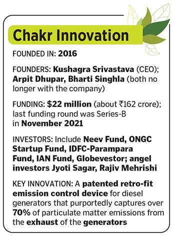 The next year, Srivastava, being a “native Delhi-ite", formally registered a company called Chakr Innovation, to develop innovations to reduce emissions that contribute towards air pollution. He spent the next 2.5 years into research and development, and in 2019, the product was ready for commercialisation. Chakr had developed what Srivastava calls the world’s first retro-fit emission control device (RECD) for diesel generators. The Chakr Sheild, a patented technology, reportedly captures over 70 percent particulate matter emissions from the exhaust of diesel generators.