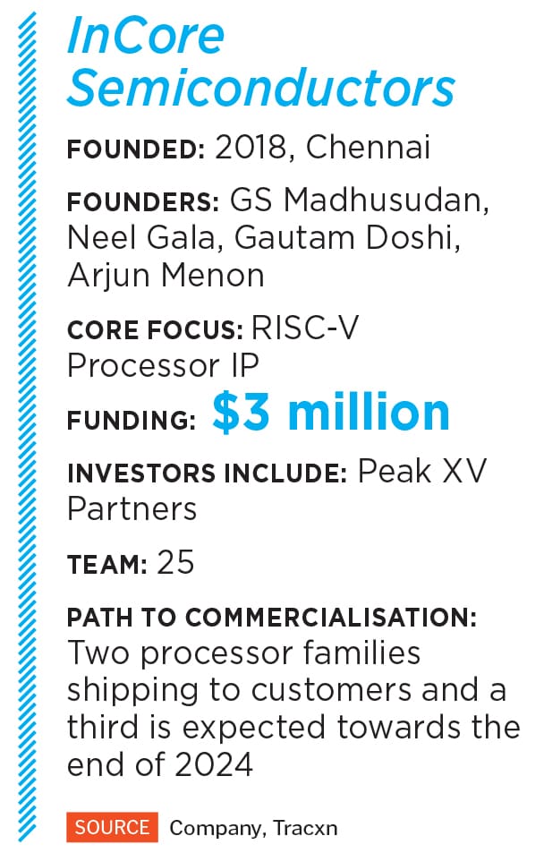 In May 2023, Peak XV (formerly Sequoia Capital’s India and Southeast Asia unit) led a $3 million seed round in InCore Semiconductors, incubated at the IIT-Madras. The company is developing semiconductor processors based on RISC-V open source architecture. And made-in-India chips and systems-on chip products based on InCore’s platform could one day have a big impact, reducing the country’s semiconductor import bill. “Ultimately, in systems, whether it be operating systems or processors, you need to build prototypes," says GS Madhusudan, InCore’s co-founder and CEO. “It’s an applied field. You can create any kind of theory you want, but something like a Microsoft Windows is bringing together hundreds of theories and practices into a practical system."