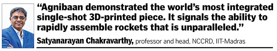 Agnibaan demonstrated “the world’s most integrated single shot 3D printed piece. It signals the ability to rapidly assemble rockets that is unparalleled", Chakravarthy said.