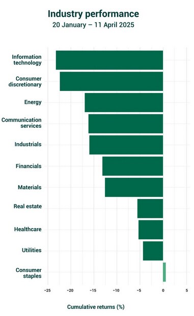 At the other end of the spectrum, information technology and consumer discretionary (non-essential goods such as automobiles and appliances) sectors experienced the most severe losses of over 20 percent. These industries share key vulnerabilities: their heavy reliance on complex international supply networks and the specialised nature of their components make it challenging to switch suppliers quickly.
