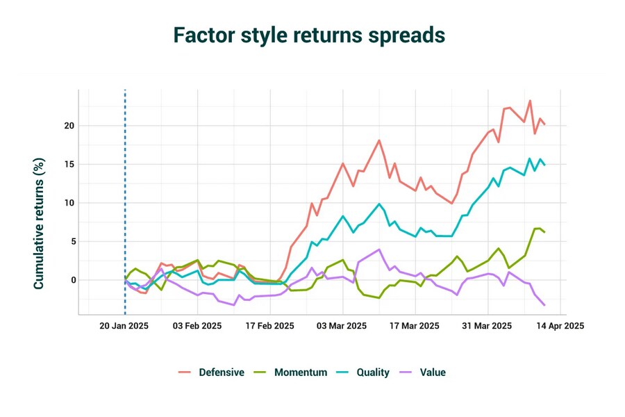 At the same time, the interconnectedness of industries and supply chains brings added complexity. The pronounced divergence between defensive and other factors may reflect the underlying supply chain dynamics driving market performance. Companies exhibiting defensive and quality characteristics – those with domestic operations, pricing power and simple supply networks, or that are under the essential product category – have demonstrated resilience despite the broader market decline.