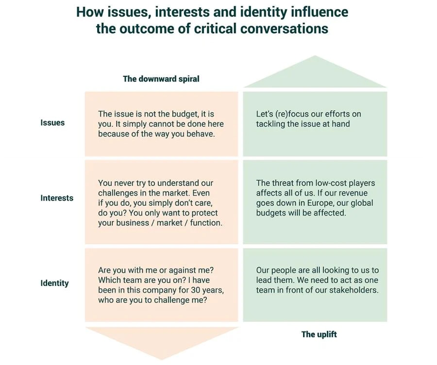 Based on my observations of over 30 executive team meetings focused on critical topics like diversity, equity and inclusion (DEI) and sustainability, I’ve identified three main elements that can influence the outcomes of such conversations: issues, interests and identity. If not managed with care, the natural process is a downward spiral. I outline a framework to guide dialogues about critical or sensitive topics, which leaders can use to turn these potentially contentious debates into productive conversations.
