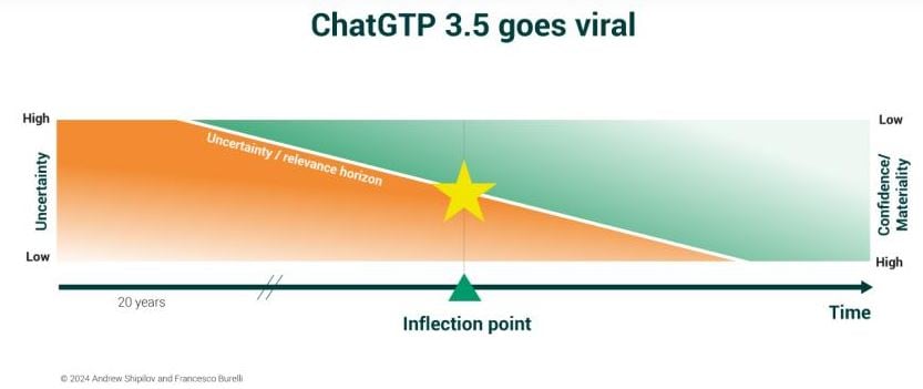 What happened? Between the summer and fall of 2022, Gen AI passed an inflection point. High uncertainty about its performance gave way to increased confidence that the technology would affect businesses in a significant way. We illustrate this trade-off between uncertainty and confidence in a simple figure below.