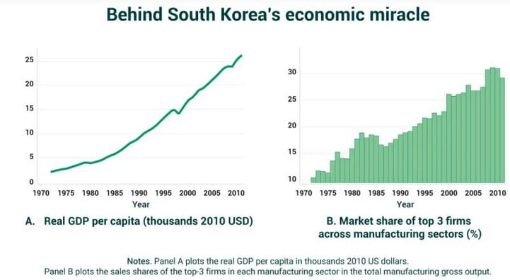 It is perhaps no coincidence that the South Korean economy is also dominated by sprawling firms or chaebols. As we found in our study, now published as a working paper by the National Bureau of Economic Research, these large firms played a pivotal part in the growth miracle of the country of 52 million people.