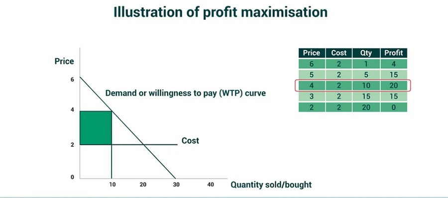 Economic theory offers clues as to how companies can translate sustainability into a “triple win": a win for society, consumers and companies. The classic price-demand graph (Figure 1) provides the baseline rationale. It represents consumers’ willingness to pay (WTP) for a product or service, with its downward slope depicting the increase in market demand as price decreases. This reflects the fact that buyers often have a very different willingness to pay because of varying preferences, use of the product, or availability (or lack thereof) of alternatives. Profit maximisation, then, involves determining the price and quantity that deliver the highest profit or producer surplus (represented by the rectangle), as shown below.