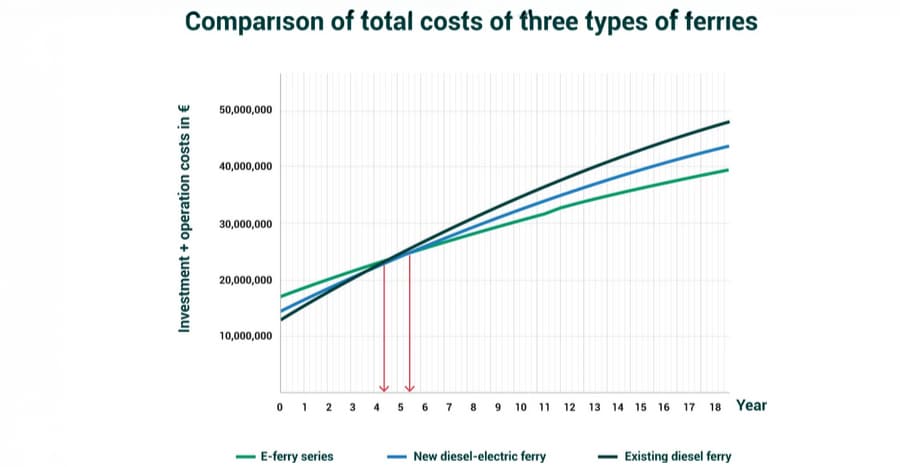 Figure 3: The total costs of diesel-powered ferries vs. hybrid ferries vs. electric-powered ferries.