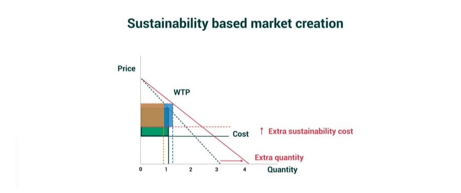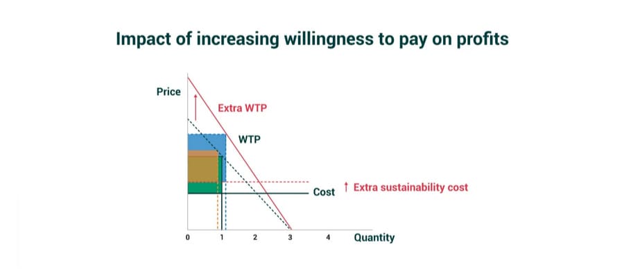 Such a sustainable business opportunity is illustrated in Figure 4. The demand curve moves up along the vertical axis, representing the increase in WTP from a segment of the market, while the demand (represented on the horizontal axis) remains unchanged. When the increase in WTP is significant enough, profits (in blue) can exceed prior profits (in green), making the sustainable innovation economically worthwhile for the business.