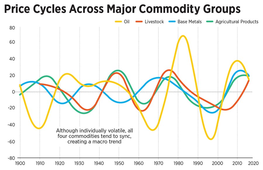 - In the 1900s: Triggered by the US’s rapid industrialisation and urbanisation in the late 19th century and the German build-up prior to World War I, driving commodity prices in the early 20th century. However, it peaked in 1917.