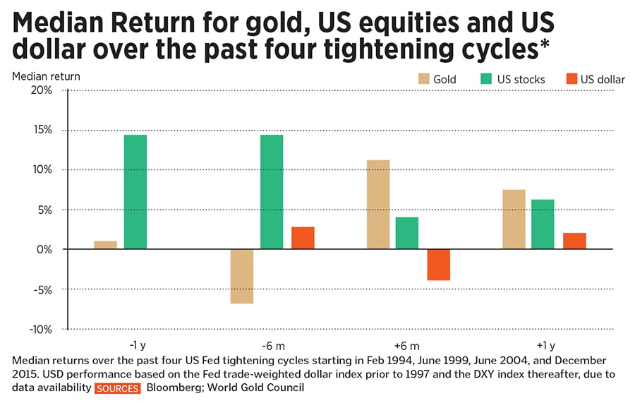 Yet, not all current dynamics are supportive for gold. In recent months, central banks across the global have signalled a more hawkish stance. With inflation racing to multi-decade highs, and likely to be more persistent, financial expectations are now for a quicker tightening of the loose monetary policy conditions which have long been supporting markets. The expectations of future monetary policy actions—expressed through bond yields—have historically been a key influence on gold price performance. With many central banks—most notably the US Fed—beginning to enter a tightening cycle, interest rates will likely rise. For gold, this can be a headwind to future performance, as it increases the opportunity cost for investors holding it. But while it has historically underperformed in the months leading up to a Fed tightening cycle, it has also significantly outperformed in the months following the first rate hike (see chart). Gold may have partly been aided by the US dollar which exhibited the opposite pattern.