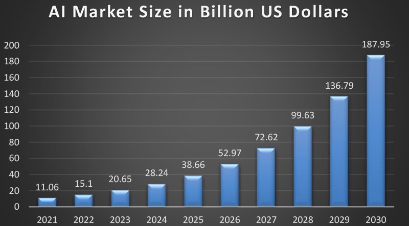 According to the Globe Newswire publication 2023, the value of AI in the global healthcare market was around $11 billion in 2021, which is anticipated to steeply increase to $188 billion by 2030 at a compounded annual growth rate of 37 percent between 2022 and 2030.