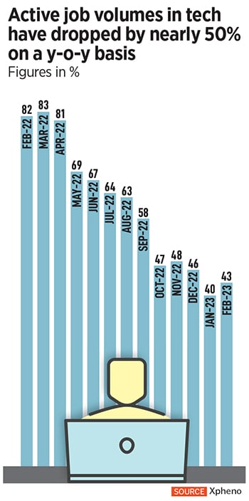 Be it a tech worker at a small startup or a large tech giant, the fear of being laid off is on everyone’s mind. As compared to the highest active demand of 273,000 from the tech sector collective, the current demand levels are nearly a 55 percent drop, according to Xpheno. Kamal Karanth, co-founder, Xpheno, explains: “It is important to note the relative drop in the tech sector’s contribution to overall active job demands in India. From the highs of over 80 percent contribution, it has dropped to under 45 percent over the year."
