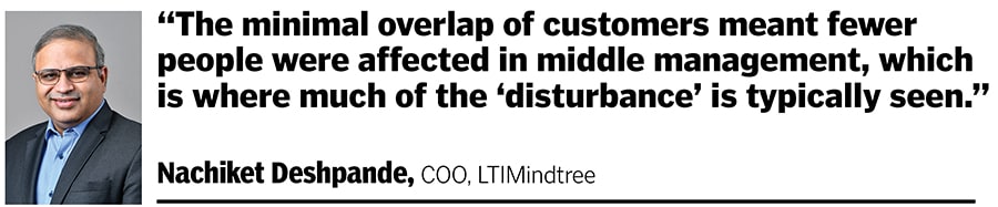 That they were public companies also meant that until the regulatory approvals were in, “what we could not do was share actual data on customers, people or competencies", says chief operating officer Nachiket Deshpande, another Cognizant veteran who joined LTI. “So that had to wait for day one."