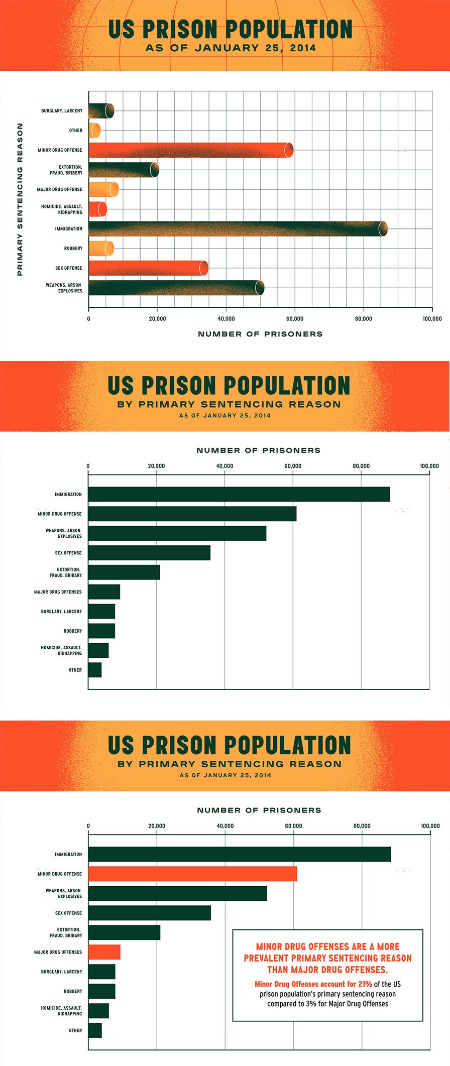 But many data-visualization gurus advocate for a different approach. One method, called decluttering, involves making graphs look cleaner so that the audience can more easily process the information. Another method, called focus, highlights the information or trend that the presenter wants people to notice—for instance, making one bar red and all of the others grey.