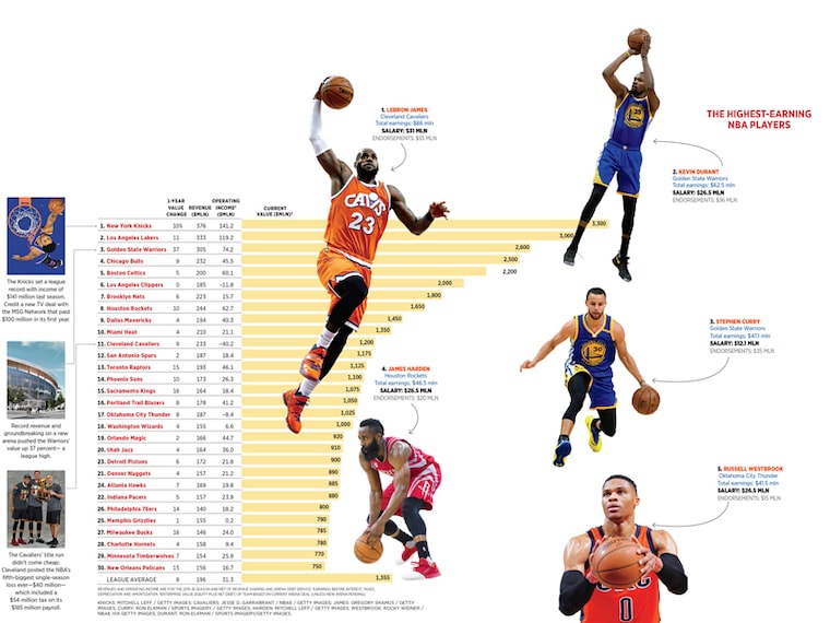 The hardwood might as well be paved with gold: the average national Basketball Association franchise is now worth $1.36 billion, a 3.5-fold increase over the last five years. Operating profits are already at a record high—an average of $31 million per team. Owners, meanwhile, are salivating at what’s on the immediate horizon: A new seven-year, collective-bargaining agreement that secures labour peace through the 2023–24 season, a nine-year, $24 billion national TV deal and increasing interest from overseas. For more on the business of professional basketball, please see forbes.com/nba .