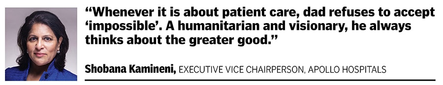 “Dad is the most driven, positive and empowering human I’ve known and that’s why he is admired all around the world. Though health care is the business of caring, one needs to take measured risks. As a case in point, India’s Indraprastha Apollo Hospital in Delhi which was the first PPP (public-private partnership) in health care in the country and even establishing South Asia’s first Proton Therapy… these were far ahead of anyone’s imagination and investment capacity, but dad took them on because he believed Indians needed them and he was right," says Kamineni. “Whenever it is about patient care, dad refuses to accept ‘impossible’. He always says, just remove the screen of ‘not possible’ from your mind and see the magic unfold. A humanitarian and visionary, he always thinks about the greater good."