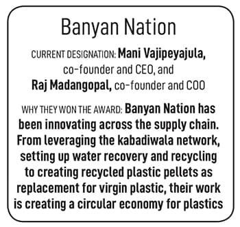 Banyan Nation has also won a number of national and international awards, including the World Economic Forum Global Technology Pioneers (2021), Circulars Award at the World Economic Forum (2018), Intel-DST Award Innovations for Digital India (2017) and many more.