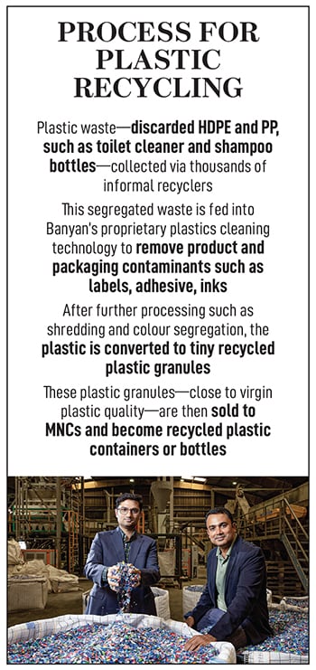 And it continues even now as Banyan Nation’s entire supply chain is fully operational. “Most brands compare the cost of recycled plastic to the cost of virgin plastic. But that is an unfair comparison to make. In contrast to virgin plastics, recycled plastics have a lot more operational overheads such as collection, segregation, washing and cleaning. At the end of the day, it is the cost of cleaning up the planet vs the cost of trashing it," adds Vajipeyajula.With their existing clients, the company has produced over 0.5 billion FMCG containers from recycled plastic in the past year. Their gross income for FY22 was ₹25.7 crore as compared to ₹12.6 crore for FY21, as per financial data provided by business information and analytics platform Tofler.