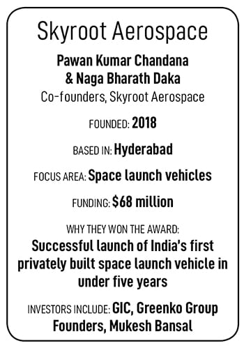 Skyroot Aerospace’s Pawan Kumar Chandana and Naga Bharath Daka stood taller than the rest, as they made Indian spacefaring history, with the successful launch of their Vikram-S rocket—the first privately built space rocket from India—in November 2022. The successful flight test showed off both the tech readiness of the Hyderabad-based venture and commercial prospects ahead.