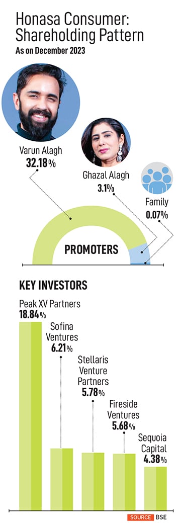 Honasa’s early investors, such as Bahl and Rohit Bansal, according to reports, entered the company at an average cost of ₹3.21 per share. Similarly, Rishabh Mariwala reportedly bought shares at an average cost of ₹6.05 per share. When they partly sold off their shares through the OFS, they harvested profits to the tune of ₹36.5 crore and ₹181.2 crore respectively. VC funds like Fireside Ventures, Sofina and Stellaris also participated in the OFS to book profits. In fact, the promoters offloaded 3 percent and own 35.3 percent now (see table).