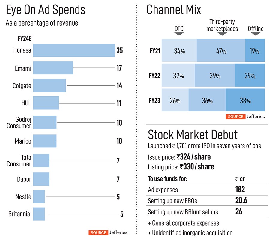 Honasa spends about 35 percent of its revenue on advertising versus 5 to 15 percent for traditional FMCG companies (see table). “High ad-spends is a key investor concern," Jefferies’ analysts note. Other unlisted peers—namely L’oreal India, Nivea India, ELCA Cosmetics and Lotus Herbals—spend about 26 percent of revenue on ad-spends, but have an Ebitda margin of 15 percent versus Honasa’s 7 percent, which analysts estimate could improve to 11 percent in two years.