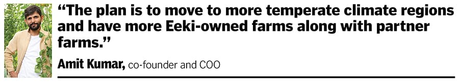 In FY23, their revenues were ₹30 crore and they are looking at ₹63 crore in the year ending March 2024. “We’re looking at being Ebitda positive by October 2024," says Singh. Scaling is also very much part of the plan where they are looking to add 200 acres by March 2025, have 700 acres by March 2026 and also “get outside of India for farms in the Middle East", says Singh. The plan is also to move to more temperate climate regions “in north, central and south India", says Kumar, as well as have more Eeki-owned farms along with partner farms.