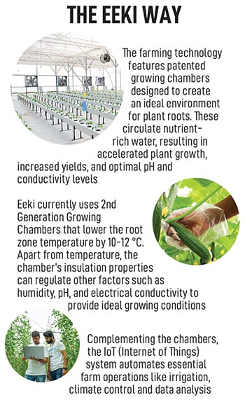 The two set up Eeki Foods in December 2018, their research farm outside of Kota in July 2019, finally starting commercial production in 2022. Today, with their patented polymer growing chambers and patent pending IoT technology that maintains the right root zone temperatures and humidity, they use 80 percent less water than traditional farming and solar panels for their energy needs. Moreover, their set-ups are often on barren land and considering the vegetables have ideal conditions of temperature, climate and nutrition, they are grown all year round, without being affected by the seasons.