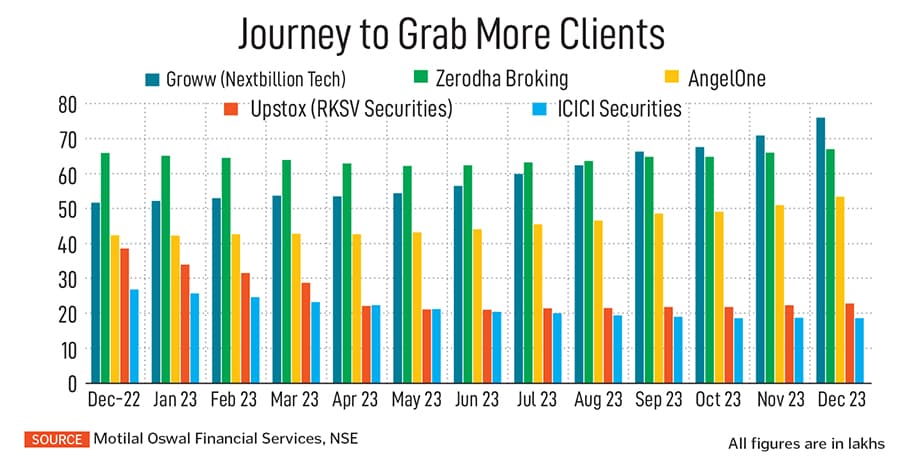 And then came the game changing moment. In September 2023, Groww toppled Zerodha to become the biggest brokerage company in India in terms of active investors on the National Stock Exchange (NSE), with 6.63 million active clients. Rival Zerodha had 6.48 active million users in the same month. Since then, the gap has been widening with Groww’s active clients increasing 49 percent to 7.6 million in December 2023 from the same month the previous year. In December 2022, it had 5.1 million active clients on the platform.