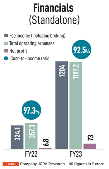 Unlike many startups that have failed to keep expenses in check, Groww managed to taste profitability within a few years of launch. In FY23 it became profitable for first time with net profit at ₹448.8 crore on a revenue of ₹1,277.8 crore. It had incurred a loss of ₹239 crore in FY22 while its revenue was ₹350 crore. On a standalone basis, its net profit was ₹73 crore in FY23, a phenomenal rise from ₹6.8 crore in the previous year. Fee income (including broking) fetched ₹1,204 crore in FY23, increasing from ₹324.1 crore in a year.