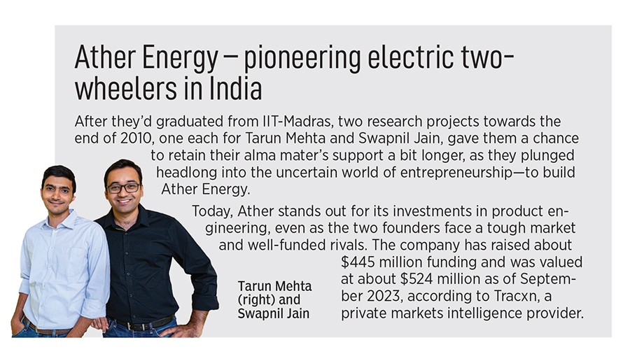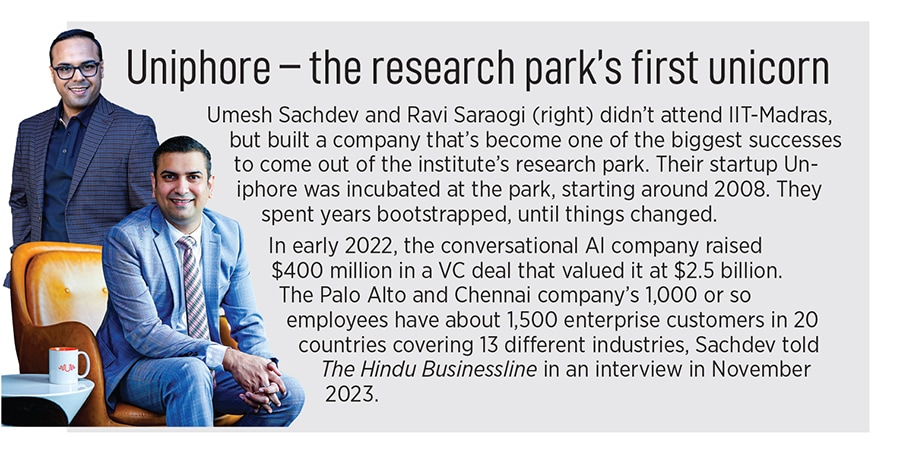 As to the startups, today those the research park incubated are collectively valued at some ₹45,000 crore, Jhunjhunwala says. Among them are companies such as Uniphore, a conversational AI company that became a unicorn in 2022—the first among those incubated at the research park—and Ather Energy, one of India’s best-known electric scooter makers.