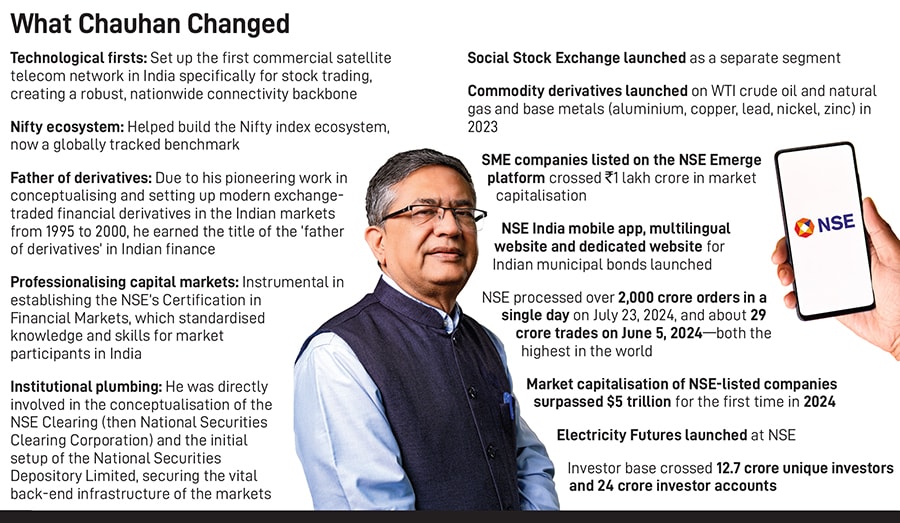Between 1995 and 2000, Chauhan’s trailblazing efforts in conceptualising and establishing modern exchange-traded financial derivatives transformed India’s markets. He is a man of many firsts. Chauhan had set up the first commercial satellite telecom network in India specifically for stock trading, creating a robust, nationwide connectivity backbone. He is also credited with setting up the first screen-based trading in India, mobile trading, mutual fund distribution through exchanges, markets for SME shares, the Nifty index and derivatives trading.