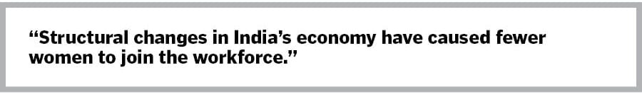 She argues against the long-accepted belief that socio-cultural norms have led to the decline in female labour force participation in India over the last 20 years. “The norm that women are responsible for household chores is a factor in explaining India’s low female labour force participation rate [around 19 percent, compared to 56 percent and 61 percent in the US and China respectively], but it doesn’t explain the decline over the last two decades," she says.