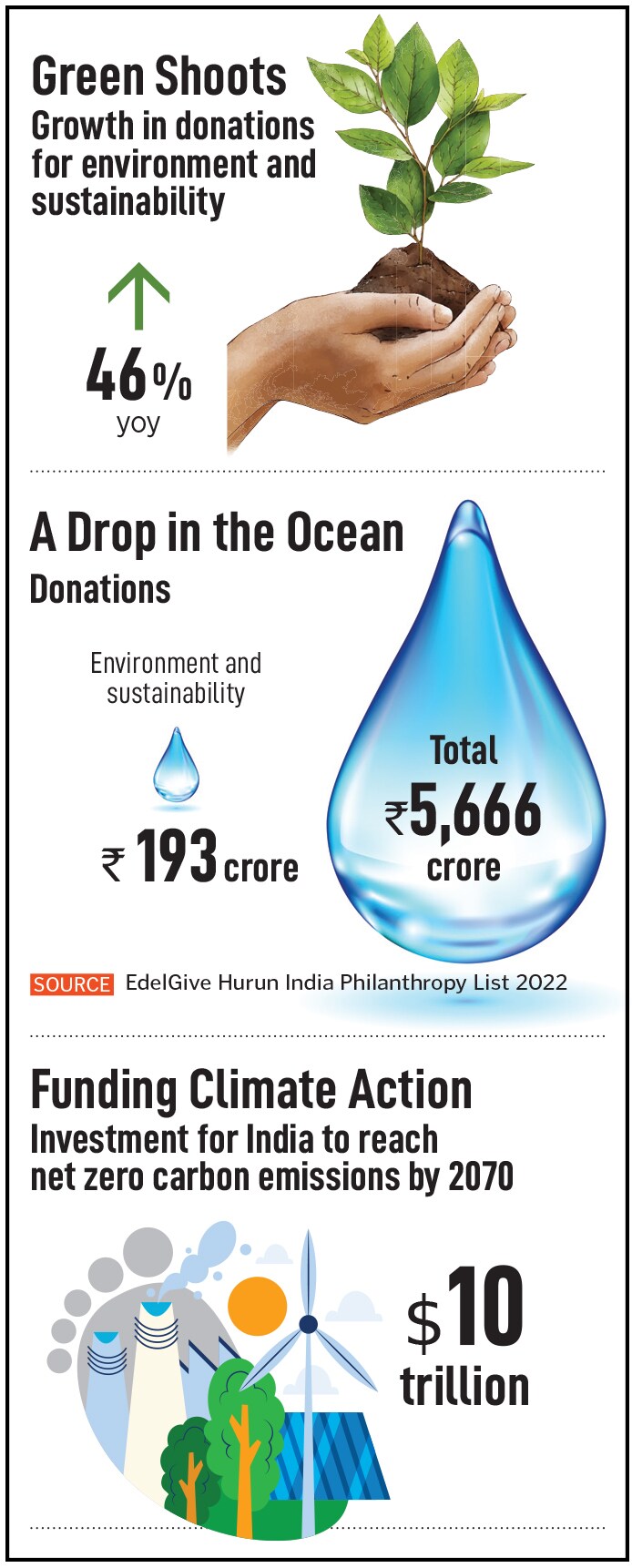 However, private and foundation philanthropy for climate action have been unremarkable so far. According to EdelGive Hurun India Philanthropy List 2022, donations towards environment and sustainability accounted for ₹193 crore out of total charitable donations of ₹5,666 crore. The silver lining is that this is an increase of 46 percent over the previous year.