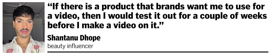 Shantanu Dhope agrees with Tomar. He believes that to be a successful beauty influencer today one also needs to be consistent. Dhope grew up doing the makeup for his mother and sister when they would go out for functions and developed a knack for it. After finishing his diploma in civil engineering, he decided to go to Fat Mu Makeup Institute in Mumbai’s Bandra. He’s been a makeup artiste for the past 10 years, and started making content only four years ago.