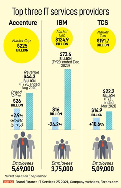 TCS has been investing more in marketing and intentionally shaping its brand. This brand-building has succeeded in narrowing the gap with Accenture, he says.