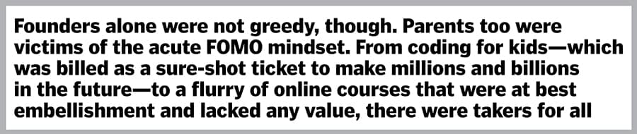 Founders alone were not greedy, though. Parents, too, were victims of the acute FOMO mindset. From coding for kids—which was billed as a sure-shot ticket to make millions and billions in the future—to a flurry of online courses that were at best embellishment and lacked any value, there were takers for all. Parents didn’t mind paying as the offline world was shut. Once schools opened, the startups started shutting down. And parents went back to an offline way of life—schools and brick-and-mortar coaching institutes.