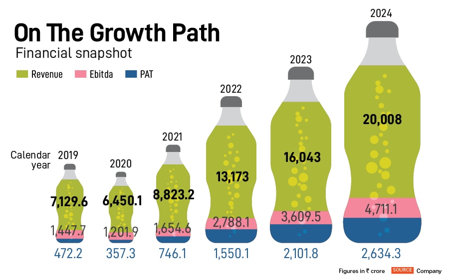 JM Financial analysts expect company sales to grow at a CAGR of 18.7 percent over the next two years. Gross margins improved by 165 basis points to 55.5 percent in CY24 versus 53.8 percent in the previous year. This was largely on account of strategic procurement and storage of PET chips for price benefits and the accruing benefits of more backward integration. Overall, Ebitda margin rose by 105 basis points to 23.5 percent last year. “While margin expansion from current healthy levels is unlikely given the focus on driving volume growth," JM Financial says in the earlier mentioned report. “Interest cost savings will drive higher earnings CAGR of 29 percent which is much better than global peers."