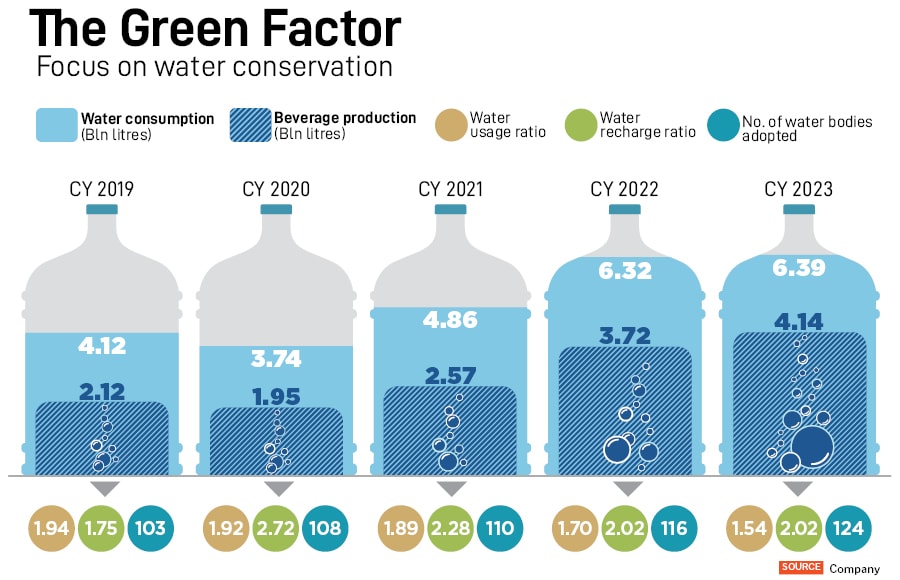 For example, as per the company’s investor presentation dated February 10, Varun Beverages has reduced its water usage. In 2021, it used 1.89 litres to produce 1 litre of beverage. This declined to 1.56 litres in 2024, and the management expects this to further improve to 1.40 litres this year. Likewise, it has increased its dependence on renewable energy sources to 79 kWh million units from 18 kWh in 2021. It hopes this will rise to 125 kWh this year. The company has also reduced plastic usage.