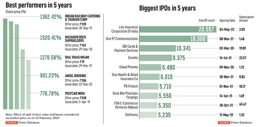 As a flurry of new IPOs hit the stock markets over the last five years, we looked at those that survived the storm and volatility with outstanding performances on the exchanges. We sieved through data of over 200 companies that got listed on main board BSE and NSE starting from 2019 till February 15, 2024, based on data provided by Prime Database.