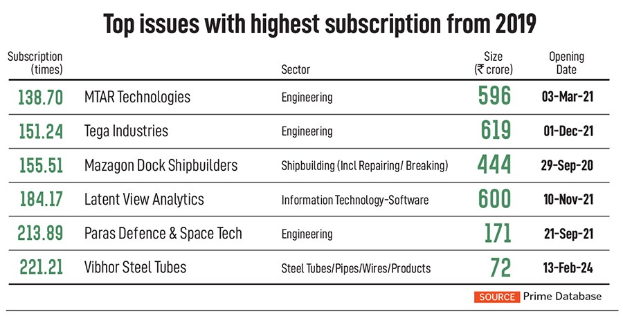 To avoid missing out any companies due to sheer size, we further divided these companies based on the issue size of ₹0-500 crore, ₹500-₹1,000 crore, ₹1,000-5,000 crore and above ₹5,000 crore. The next step was to pull out issues that received over 100 times subscriptions for small and mid-sized issues and 50 times for companies with ₹1,000 crore and above issue. For the final cut, we reviewed the performance of stock prices of these shortlisted ones on a six-month period, based on which we further arrived at 10-15 companies that went public in the last five years, received overwhelming subscription and were still performing well on the stock exchanges.