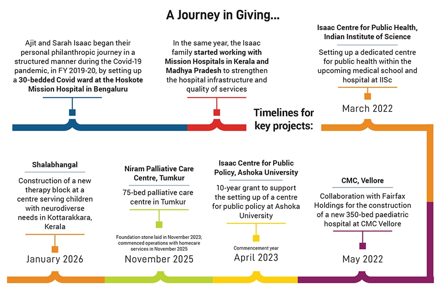 Thomas highlights how despite the lack of any compulsion on the Isaac family to give money towards personal philanthropy, they are choosing to give. “They are very, very invested in giving it very meaningfully because no one gives this quantum of money and doesn’t want to know that it is being used well,” she says, adding that Ajit sits on advisory boards of all the large grants for the Niram Palliative Care Centre because it was in-house; they have been involved in all the staffing decisions, all the construction decisions, all the major strategic outreach decisions.