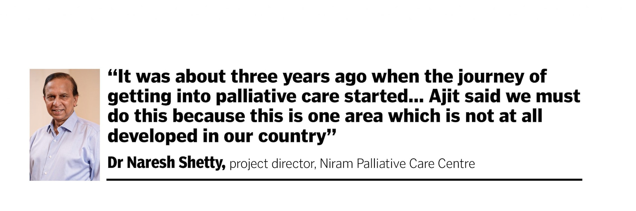 It did not take much to convince Ajit and Sarah, who immediately recognised the need for palliative care in the country. “He said, we must do this because this is one area which is not at all developed in our country,” recalls Shetty, an orthopaedic surgeon who was president of the Ramaiah Memorial Hospital in Bengaluru for 28 years; the hospital has a pain and palliative care vertical for patients with terminal illnesses.