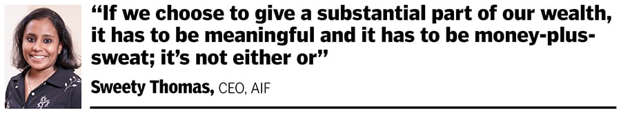 Ajit and Sarah’s personal philanthropic work—as distinct from the CSR initiatives of Quess Corp—support areas that otherwise do not find support very easily. “That’s a core responsibility that we have, as a family philanthropic foundation; we have the responsibility to support very high-need yet niche areas. This governs how we pick up causes, identify high-need areas that are not often supported by, say, a typical, institutional large CSR mandate because of multiple reasons,” says Sweety Thomas, CEO, AIF.