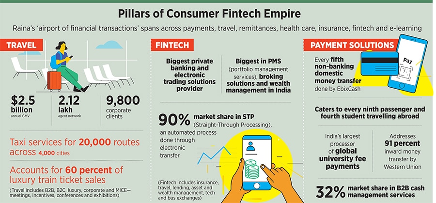 The thumping domination was acquired. Raina snapped up the number one, number three and number four companies in the pecking order—Centrum, Weizmann and Essel Forex. Pre-Covid, the company was handling around $7 billion in transactions in India. “We are there in almost every airport in India," he says. “In fact, we are exclusive in 21 airports out of 31." In remittance, the company does around six-and-a-half billion dollar transactions and has over 320,000 agents in India, he claims. In bus exchange technology, 14 state roadways do business with the company. Over 38,000 buses in Maharashtra use the tech provided by Raina. “Every ticket that is sold, we make a few pennies on it," he says.