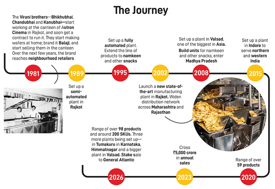 “And we kept moving forward, kept taking loans, ₹1 crore, ₹2 crore, ₹5 crore, ₹25 crore, ₹100 crore, we took loans up to ₹200 crore. We have so far invested ₹2,500 crore… and put up factories, but for the past 15 years, we have not taken any loans for expansion and projects,” says Virani, who started out with his two brothers. Bhikhubhai and Kanubhai, running a cinema canteen, going on to become a supplier of wafers to the canteen and then selling them in the open market. They founded Balaji Wafers in 1982, and incorporated it as a company in 1995.